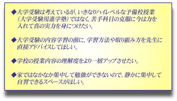 もちろん、現状で苦手な科目を中心に、学校に密着した補習も行い、わからないところはわかるところまで戻って教えていきますので、わかるまで学べる授業内容です。定期テストや実力テスト対策もありますので、まさに『個人個人にあわせた大学受験』と言えるクラスです。