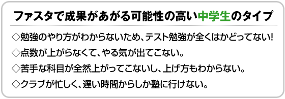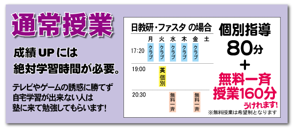 ファスタ方式とは、そんなお子さんに「小さな目標」を学業面であたえていく、そんな方式なのです。学生の時に勉強しか出来なかったタイプの先生は「クラブばかり力を入れずに勉強しなさい」とか「勉強に専念するためにクラブをやめなさい」と言われるらしいのですが、ファスタの考え方は全く逆です。クラブ活動は「目標を持ち達成し、充実感を得る」などの「頑張りかたの方程式」を学生に教えてくれます。ファスタの先生達にもクラブで近畿大会、全国レベルの人間がたくさんいますよ。