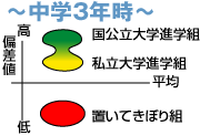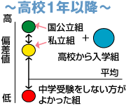 本来私国立生のカリキュラムでは高校課程は中3の段階で、すでに始まっています。ですから高校から入学してくるお子さんに比べ上位組はかなり有利な形で大学受験に望めます。しかし中3時に「置いてきぼり組」のお子さんはこの時期に動かなければ本当に「中学受験をしない方がよかった組」になってしまいます。ここまでくると逆にあせっても何も始まりません。自分は高校受験で入学してきたのだと思い、もう一度基礎からじっくり学んだ方が最終到達点は高くなります。でも、出来る事なら、こうなる前にお父様・お母様がお気付きになってあげてください。