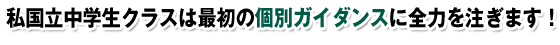 長年このクラスをやってきて常々思うのが「このクラスこそ生徒さん個々人の現状をよく把握しきれないと、到底成果に結びつけにくい」という事です。どの科目がどこから苦手になりだしたか、その生徒さんはどのような教え方が一番理解しやすいと思ってくれるのか、どのタイプの教師を受け入れ前向きに取り組んでくれるのか、どれくらい自信をなくしてしまっているのか、言いだしたら切りがないくらいそのお子さんにとってベストの環境を整えるためにお聞きし、お教えする時間、それがファスタ独自の個別ガイダンスなのです。