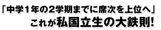 私国立中学入学時はある一定の学力検査テストをクリアしてきたお子さん達の集団なので、上下の差はさほどありません。小学生時に学んだ中学受験用の学習内容を中学校で引き続き習う事もないので、自分で頑張れるお子さんなら入学時の席次が下位でも、1学期のテストで上位に入る事は十分に可能です。逆に上位入学していても、「いつか学校がどうにかしてくれる!だって私立だもの!」の考えが勉強のやり方がわからないお子さんをあっという間に下位にいかせてしまう時期です。