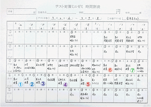 | ↑実際のテストスケジュール がこちらです↑①~⑦が個別授業、 他の枠が自習になります。個別授業と連動して 自習をすすめますので 内容の定着を確実に していきます。 | |